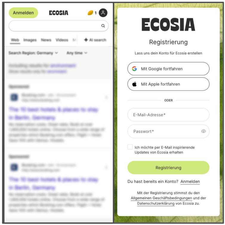 - Wenn du bereits ein Ecosia-Konto hast, nutze dieselbe Anmeldemethode wie zuvor.